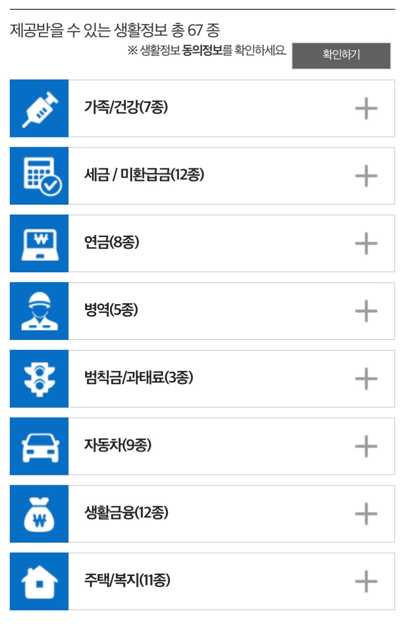 근로장려금 대상자, 자녀장려금 대상자, 여권만료일, 예비입주자 순위, 출입국 사실증명, 개인통관 고유부호, 분실 주민등록증 조회, 여권발급 이력 조회, 건축물에너지 사용량/등급, 통합문화이용권 신청 대상, 전기요금 조회 |