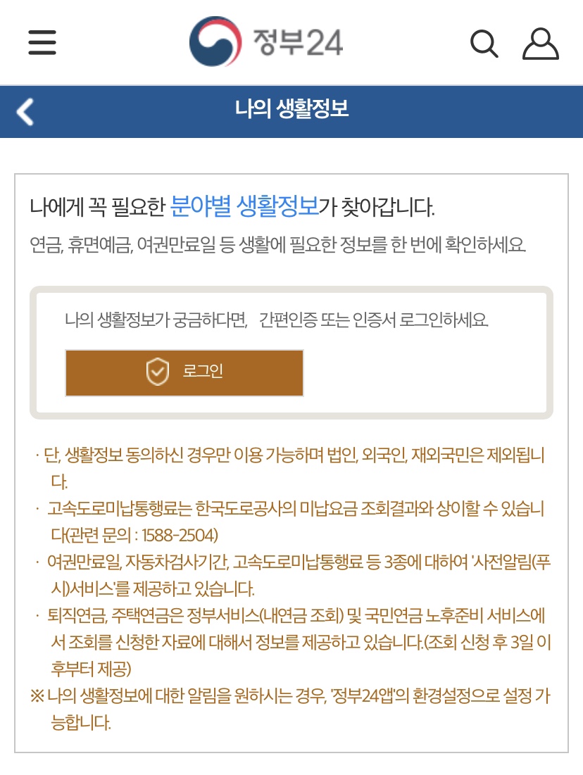 정부24 나의 생활정보 서비스에서는 나에게 꼭 필요한 분야별 생활정보를 조회 할 수 있습니다.