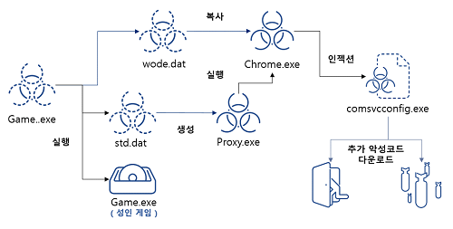 사용자 입장에서는 악성코드가 압축 파일 내부에 index.dat 이름으로 저장되어 있던 원본 게임 실행 파일을 Game.exe라는 이름으로 변경한 후 실행시키므로, 게임이 문제 없이 동작하는 것으로 착각하게 된다. 실질적으로 악성 행위를 수행하는 악성코드는 Program Files 경로 Chrome 폴더에 생성된 인젝터(Injector) 악성코드 Chrome.exe이다.