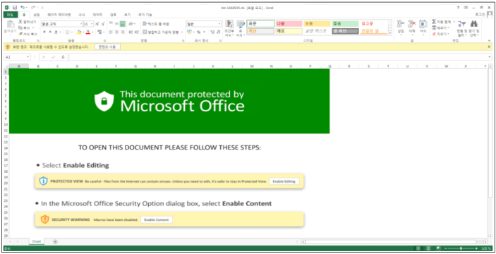 ASEC은 이전 블로그 게시물을 통해 매크로 시트를 이용한 악성 엑셀 문서가 피싱 메일을 통해 국내에 다수 유포 중임을 소개했다. 이후 유사한 공격 형태를 모니터링 하던 중, 유사한 형식의 파일이 다량 유포되는 정황을 확인했다.