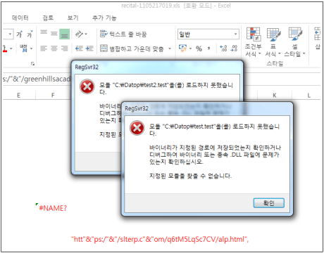 현재는 다운로드가 되지 않기 때문에 아래와 같이 매크로 실행 시 오류가 발생하지만, 내부적으로 확보한 ‘test.test’ 유형의 파일은 뱅킹 악성코드의 일종인 Qakbot인 것으로 확인됐다.