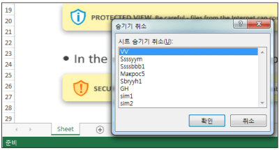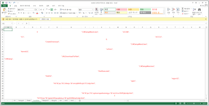 최초 엑셀 파일을 실행했을 때에는 다음과 같이 숨긴 시트가 확인되며, 숨겨진 시트들에는 흰색의 텍스트로 분산 은닉되어있는 데이터가 존재한다.