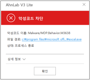 현재 V3 에서는 파일 진단 뿐 아니라 아래와 같이 행위 탐지로 해당 악성코드를 사전에 차단한다.