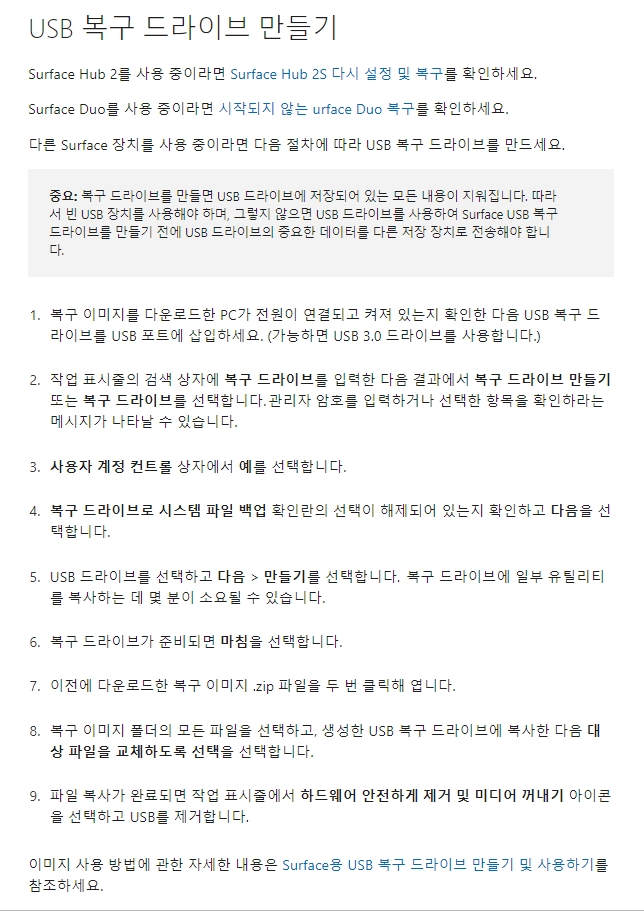 자세한 방법 안내는 아래 링크 Surface용 USB 복구 드라이브 만들기 및 사용하기를 통해 Windows 11, Winodows 10, Windows 8.1 복구이미지 만들기 및 Surface 재설정 방법이 자세하에 안내되어 있습니다