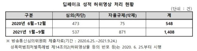 정부 산하기관인 디지털성범죄피해자지원센터에서 1만 1,891건의 성적 딥페이크 영상을 확인한 결과 아이돌 등 가수(71%), 배우(5.5%) 등 유명인의 피해가 컸지만, 학생·직장인 등 일반인을 대상으로 한 딥페이크 영상도 19.5%를 차지했다