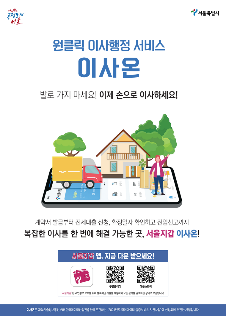 | 이사 전후로 각종 서류 발급과 확정일자 확인, 전입신고까지…처리할 일들이 참 많은데요, 이제는 발품 파느라 고생하지 마시고 서울지갑 앱 ‘이사온' 서비스로 이사 관련 행정업무를 한 번에 해결해보세요. 부동산 전자계약서, 건강보험자격득실확인서 등 여러 기관의 서류들을 원클릭으로 다운받고, 이를 연계된 은행에 제출해 ‘전세대출 신청’까지 할 수 있습니다. 이사가 편리해지는 서울지갑 앱 ‘이사온 서비스’ 꼭 기억해두세요! |