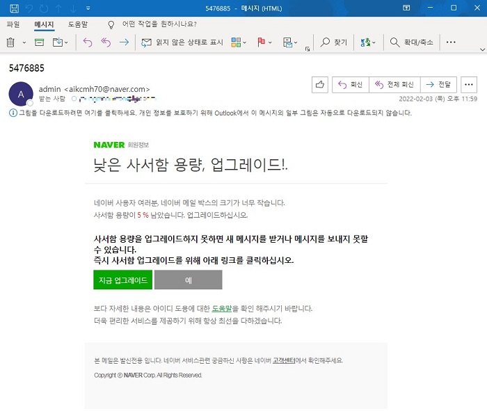 최근 ASEC 분석팀은 국내 유명 포털 서비스를 사칭해 이용자의 정보를 수집하는 피싱 메일을 확인했다. 피싱 메일은 메일함의 용량을 업그레이드를 요구하며 링크 클릭을 유도하는 내용으로 구성되어 있으며, 사용자가 링크를 클릭할 경우 비밀번호 입력을 유도하는 피싱 사이트로 연결된다.