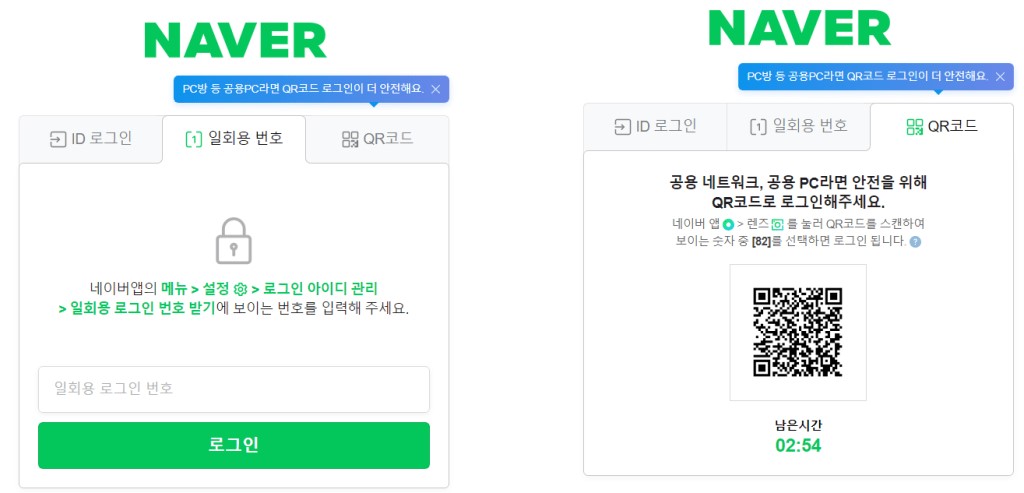 [그림 3] 정상 사이트의 일회용 번호, QR코드 로그인 기능