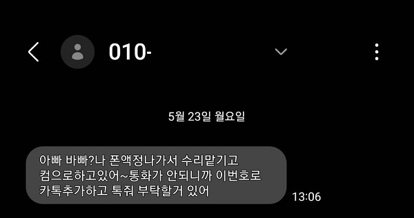 [그림 2] 가족을 사칭한 피싱 문자