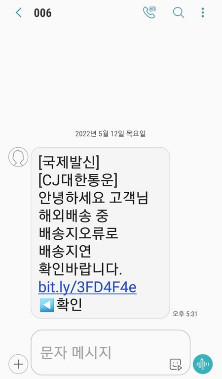 [그림 1] 악성 링크를 포함한 피싱 문자