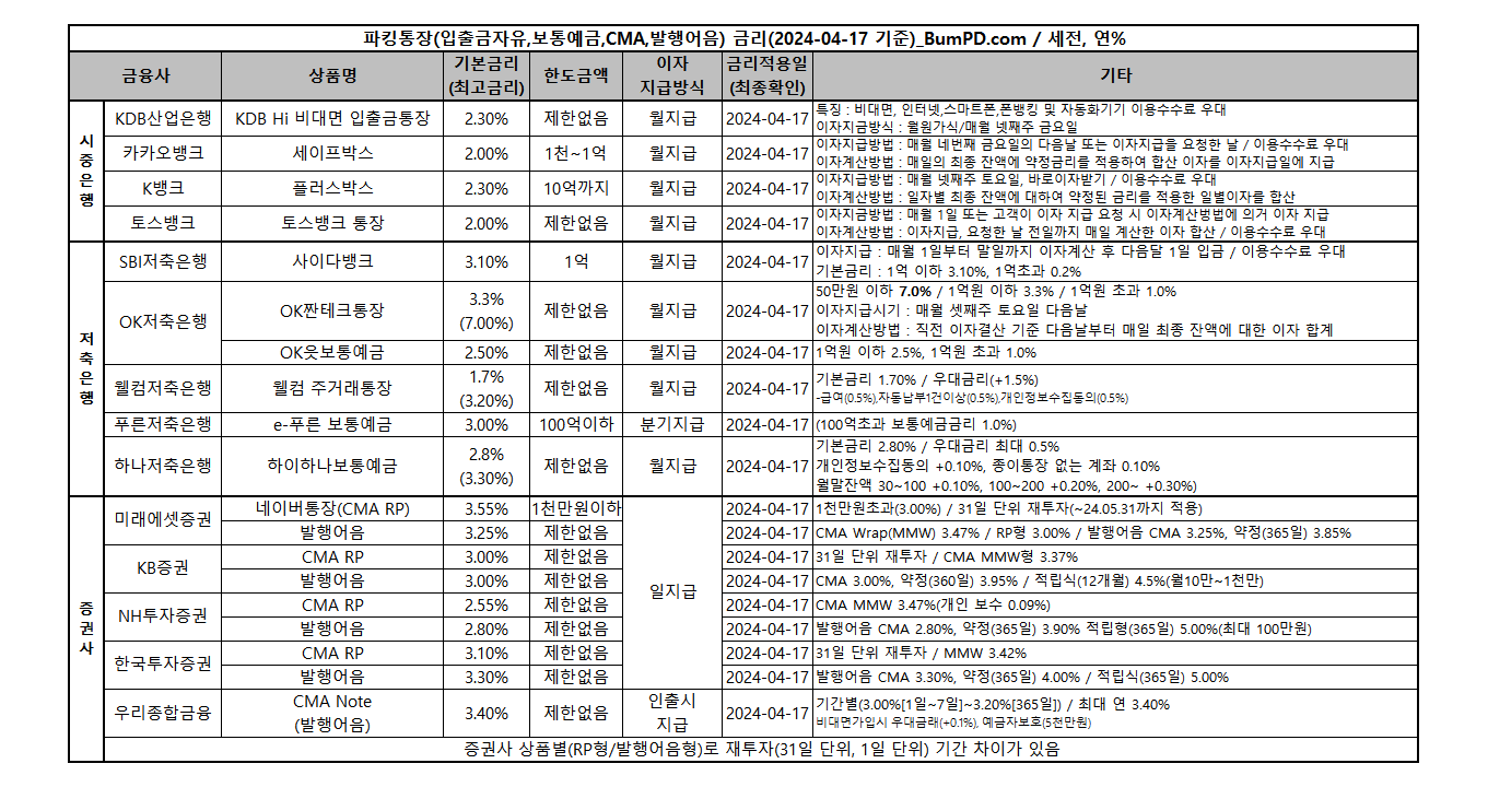 2024년 4월 17일 기준 파킹통장 금리 현황 입니다.