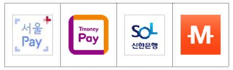 | 서울pay | 티머니페이 | 신한SOL | 머니트리 | ||||